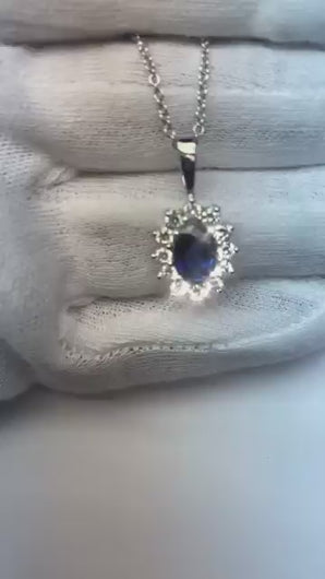 Steenspecificaties: Er is één blauwe saffier in het midden van ca. 2 karaat (ong. grootte 8 x 6,5 mm) en ca. 1,20 karaat kleinere ronde diamanten aan de zijkant. Natuurlijke aarde gedolven stenen.